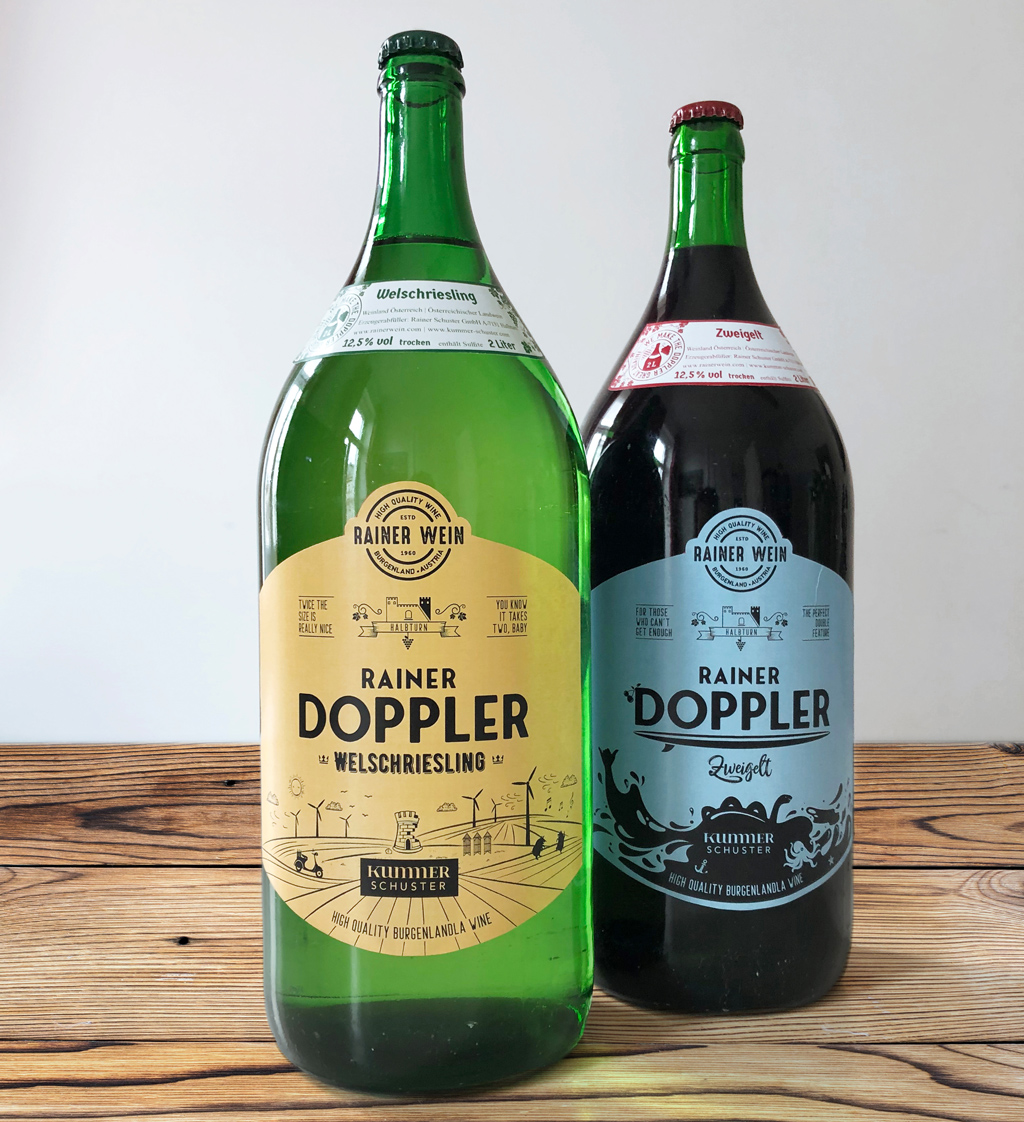 Kein anderes Gebinde eckt in der Weinszene mehr an als der gute alte Doppler. Die 2L-Flasche – oder Austro-Magnum, wie sie auch liebevoll genannt wird – wird von den einen verspottet und von den anderen als Kultobjekt verehrt. Rainer hat den Doppler für seine Weine wieder entdeckt. Denn die Lagerfähigkeit von Weinen spricht für größere Gebinde. Und genau hier setzt die neue Weinlinie der Doppler-Renaissance an. „Der Wein entfaltet sich in einem größeren Gebinde ganz hervorragend. Deswegen steht der Doppler bei uns für Qualität und ist ein Kulturgut, das wir nicht aussterben lassen wollen. Der Doppler soll wieder salonfähig gemacht werden.“, so Rainer Schuster im ORF Interview. Diese Aktion hat nämlich medial auch schon große Wellen geschlagen und so entwickelte sich eine eigene Doppler-Community. Unter dem Namen „Doppler Affäre“ haben sich 16 Winzer, darunter auch unser Weingut, zusammengeschlossen, um gemeinsam die Vermarktung des Dopplers umzusetzen. Rainer Wein ist mit 2 Weinen vertreten – Welschriesling und Zweigelt jeweils in limitierter Auflage und mit hochwertigem Inhalt und stylischer Aufmachung.