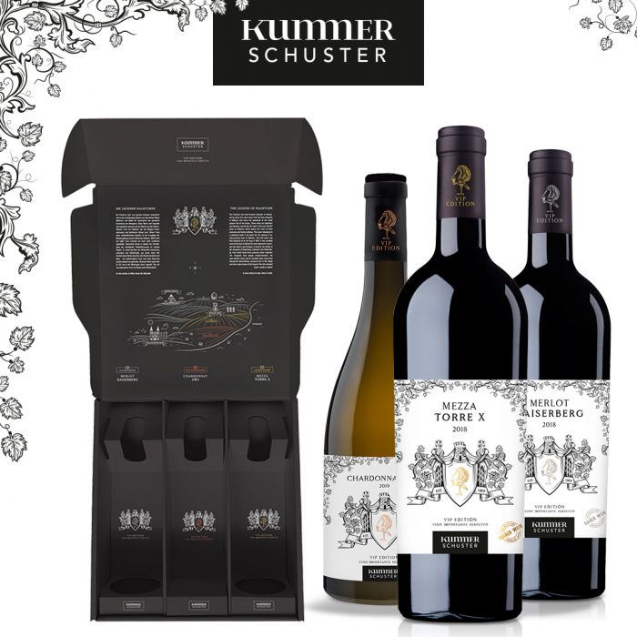 Dieses Paket enthält je eine Flasche der drei Top-Weine „Chardonnay 2M2“, „Merlot Kaiserberg“, „Mezza Torre X“. Sie wird in einem schwarzen VIP Paket mit persönlicher Widmung ausgeliefert. Das perfekte Geschenk für einen Weinliebhaber. Jedes Paket ist ein Unikat, da alle Flaschen nummeriert sind! Die perfekte Limited Edition!
